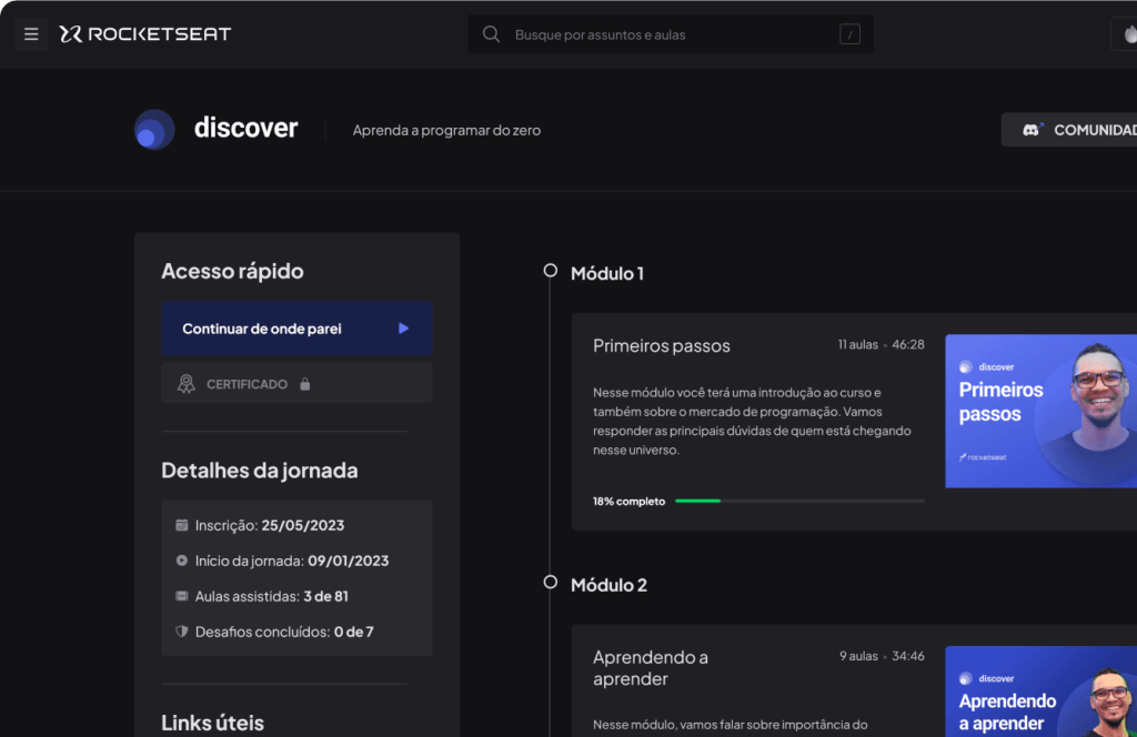 “O conteúdo do Discover é além do básicoe totalmente gratuito. Quando alguém me pergunta o que aprender ou onde, a resposta é automática: Discover da Rocketseat”